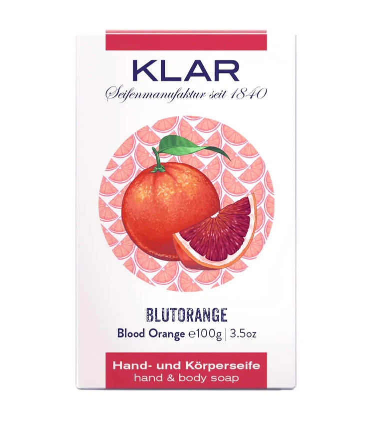 Klasické mydlo Klar Blood Orange Soap (100 g) s esenciálnym olejom z červených pomarančov lisovaných za studena, ktorý má relaxačný a revitalizačný účinok na kožu. Svieža vôňa citrusov oživuje ducha. Vyrobené z rastlinných olejov (kokosový, olivový). Neobsahuje syntetické konzervačné látky. Vyrobené v Nemecku.