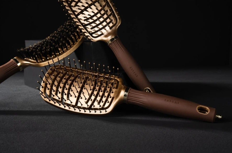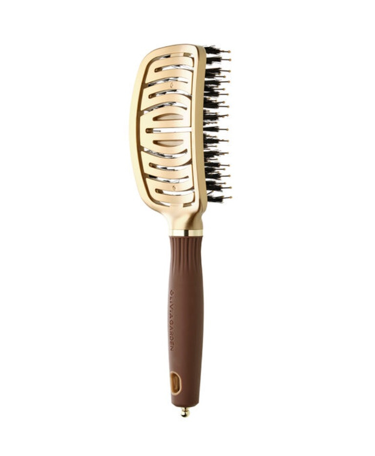 Olivia Garden Expert Flex Gold & Brown je profesionální plochý kartáč s kančími štětinami a flexibilním tělem, který zajišťuje šetrné rozčesání, přirozený lesk a lepší kontrolu nad účesem při každodenním stylingu.