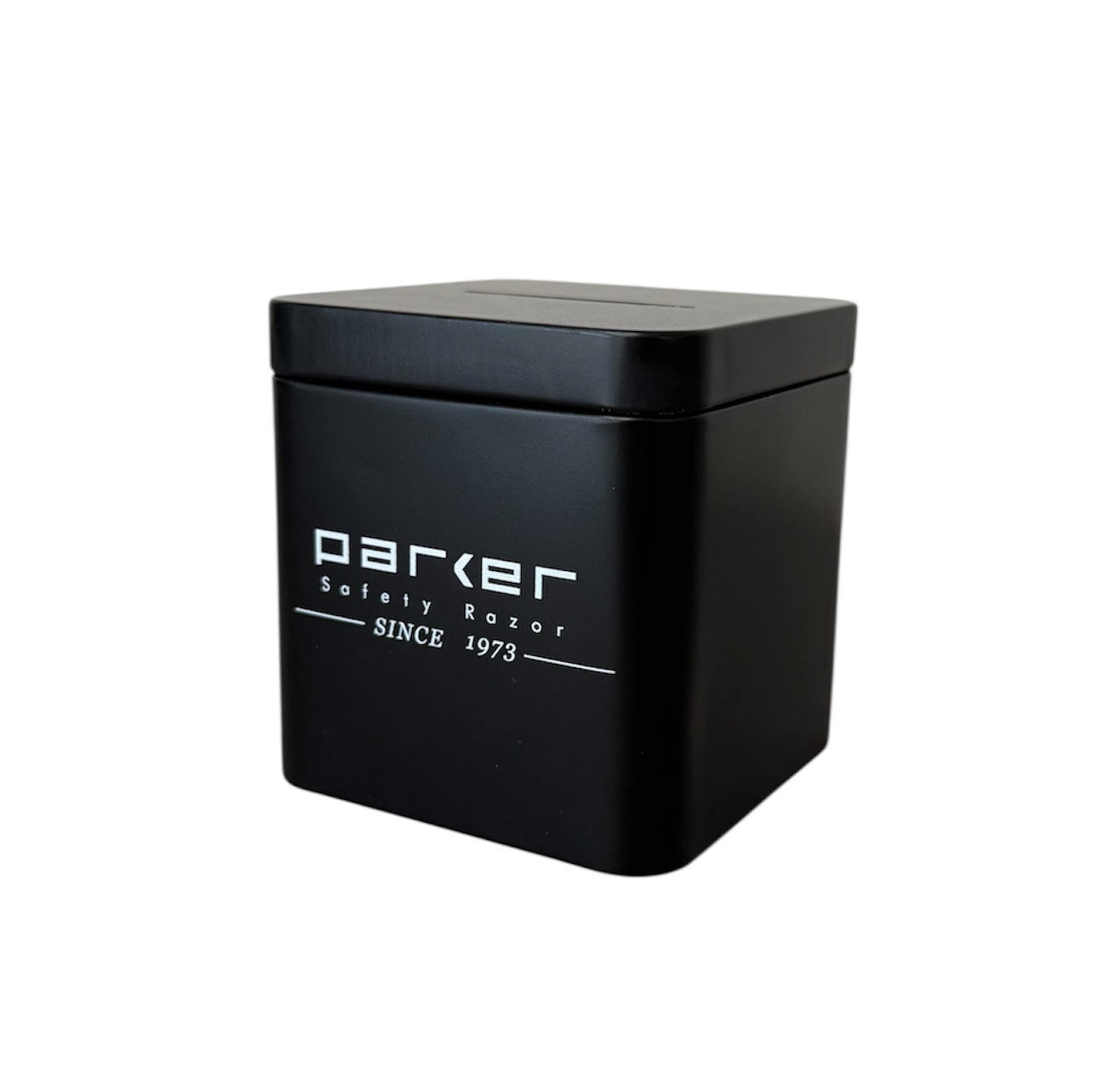 Plechový box Parker pre bezpečné uloženie použitých žiletiek. Po naplneniu - vlezie sa do neho cca 90 žiletiek - ho môžete vyhodiť alebo ho zospodu otvoriť a žiletky vyhodiť. Rozmery 7,2 x 7 x 7 cm. Vyrobené v Číně.