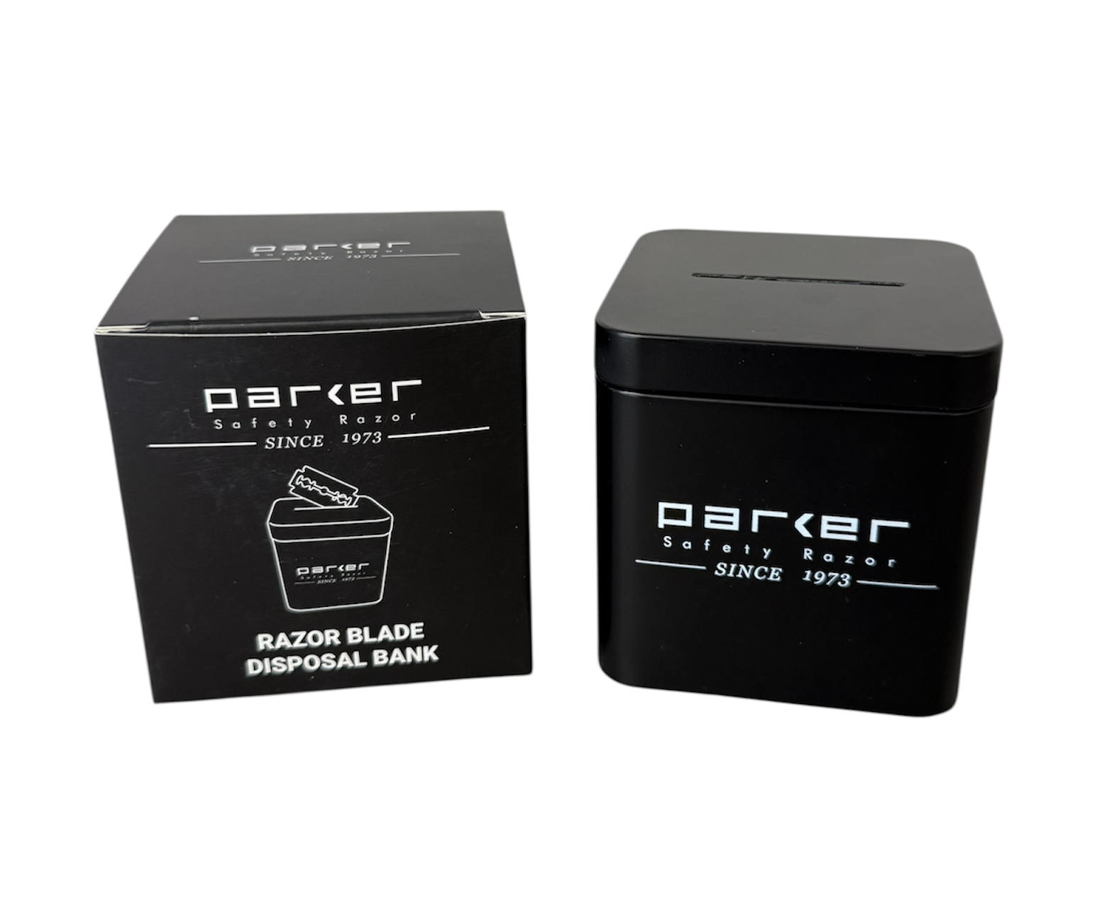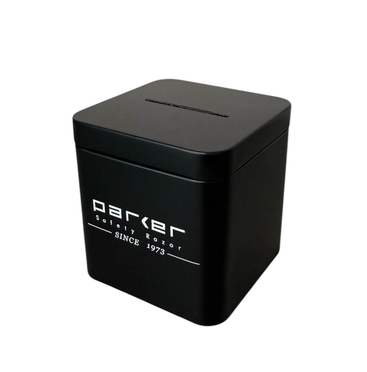 Plechový box Parker pre bezpečné uloženie použitých žiletiek. Po naplneniu - vlezie sa do neho cca 90 žiletiek - ho môžete vyhodiť alebo ho zospodu otvoriť a žiletky vyhodiť. Rozmery 7,2 x 7 x 7 cm. Vyrobené v Číně.
