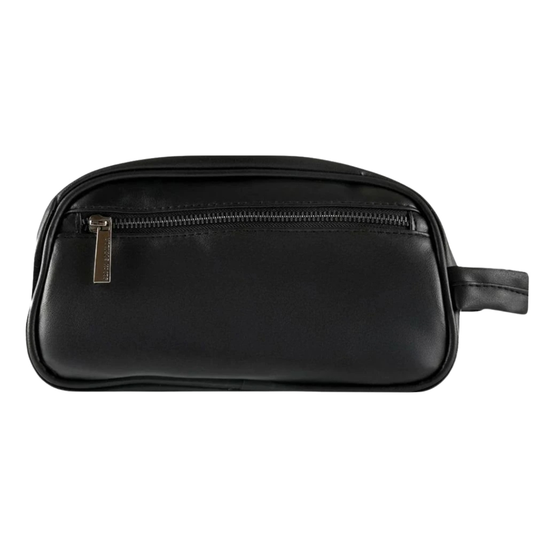 Toaletná taška od Slick Gorilla je priestranná a má zapínanie a zadné vrecko na zips. Vyrobená z vegánskej kože v čiernej farbe a s logom Slick Gorilla. Jej rozmery sú 24 x 13 x 11 cm.