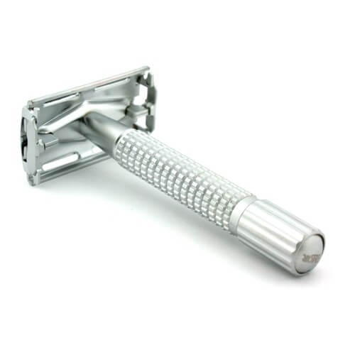 Kvalitní holicí strojek Timor v matné povrchové úpravě s hlavicí typu butterfly - hlavice se šroubováním rozevírá a tím umožňuje bezpečnou a rychlou výměnu žiletek. Vyrobeno firmou Giesen und Forsthoff, která sídlí v Solingenu. Délka holicího strojku je cca 8 cm, hmotnost je 63 g. Dodáváno v papírové krabičce s 1 žiletkou.