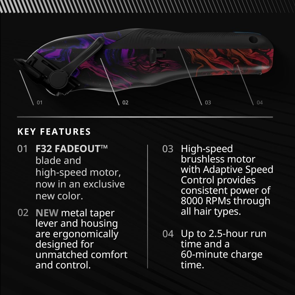 Limitovaný profesionálny strihací strojček WAHL Vapor ponúka špičkový výkon a komfort. Nová odľahčená inovatívna strihacia hlavica F32 FadeOut má dvojnásobný počet zubov ako bežné strihacie hlavice, zuby sú hlbšie a jemnejšie. Hlavica je vyrobená z ocele s vysokým obsahom uhlíka s PVD chrómovým a čiernym DLC povlakom, je ultra pevná, odolná voči korózii a zostáva ostrá až 4x dlhšie ako bežne strihacie hlavice. Vďaka bezuhlíkovému motoru s 8000 ot./min. a lítiovej batérii, ktorá umožňuje až 150 minút bezdrôtovej prevádzky, má strojček hladkú a efektívnu prevádzku. Ľahký, ergonomický dizajn s hmotnosťou iba 280 g zaisťuje pohodlné držanie a robí z neho ideálny nástroj pre dlhodobé používanie bez únavy. Hydrografické farbenie robí z každého kusu originál.